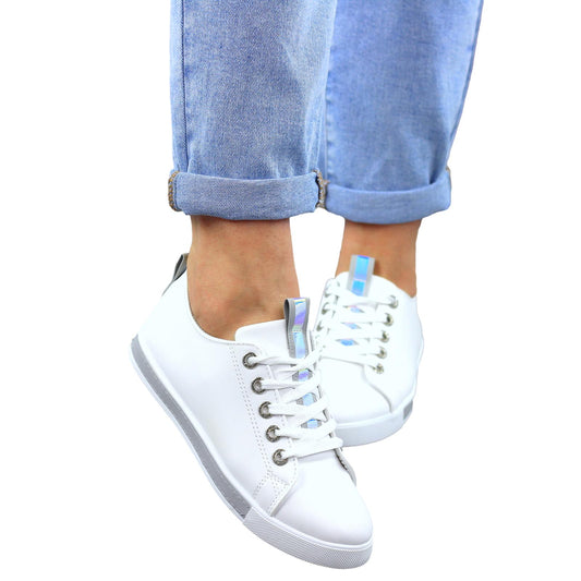 BIAŁE SKÓRZANE GŁADKIE TRAMPKI DAMSKIE efekt holo