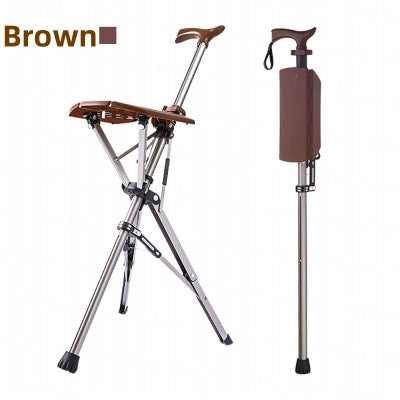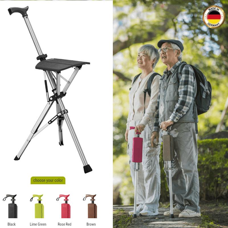 Przenośne składane krzesło z laską --- Niemiecka ręcznie wykonana konstrukcja, regulowana wysokość, odpowiednia dla osób starszych do poruszania się i użytkowania