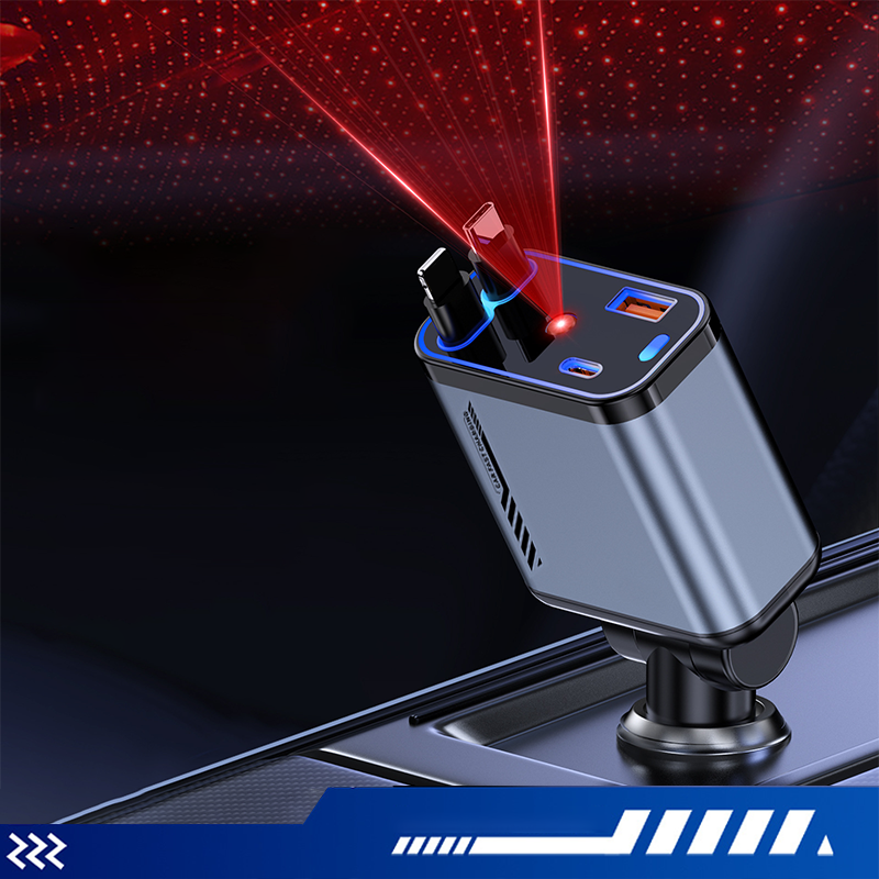 ROZKŁADANY KABEL – Wbudowany, rozsuwany kabel pomaga utrzymać porządek w samochodzie i uniknąć splątania kabli. Możesz łatwo wyciągnąć kabel w razie potrzeby, a następnie schować go z powrotem po użyciu, utrzymując porządek w samochodzie i unikając splątania kabli.