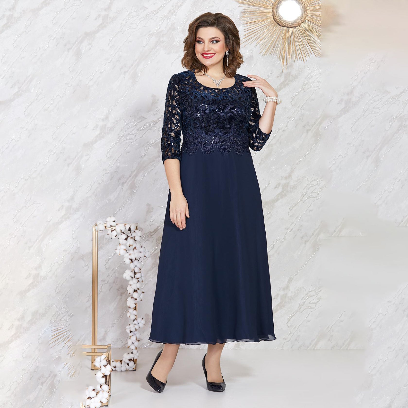 【Tkanina】 ---- Haftowana kwiecista koronka dodaje tej sukience odrobinę słodyczy. Ta damska sukienka midi ma dopasowany krój i elegancką sylwetkę.