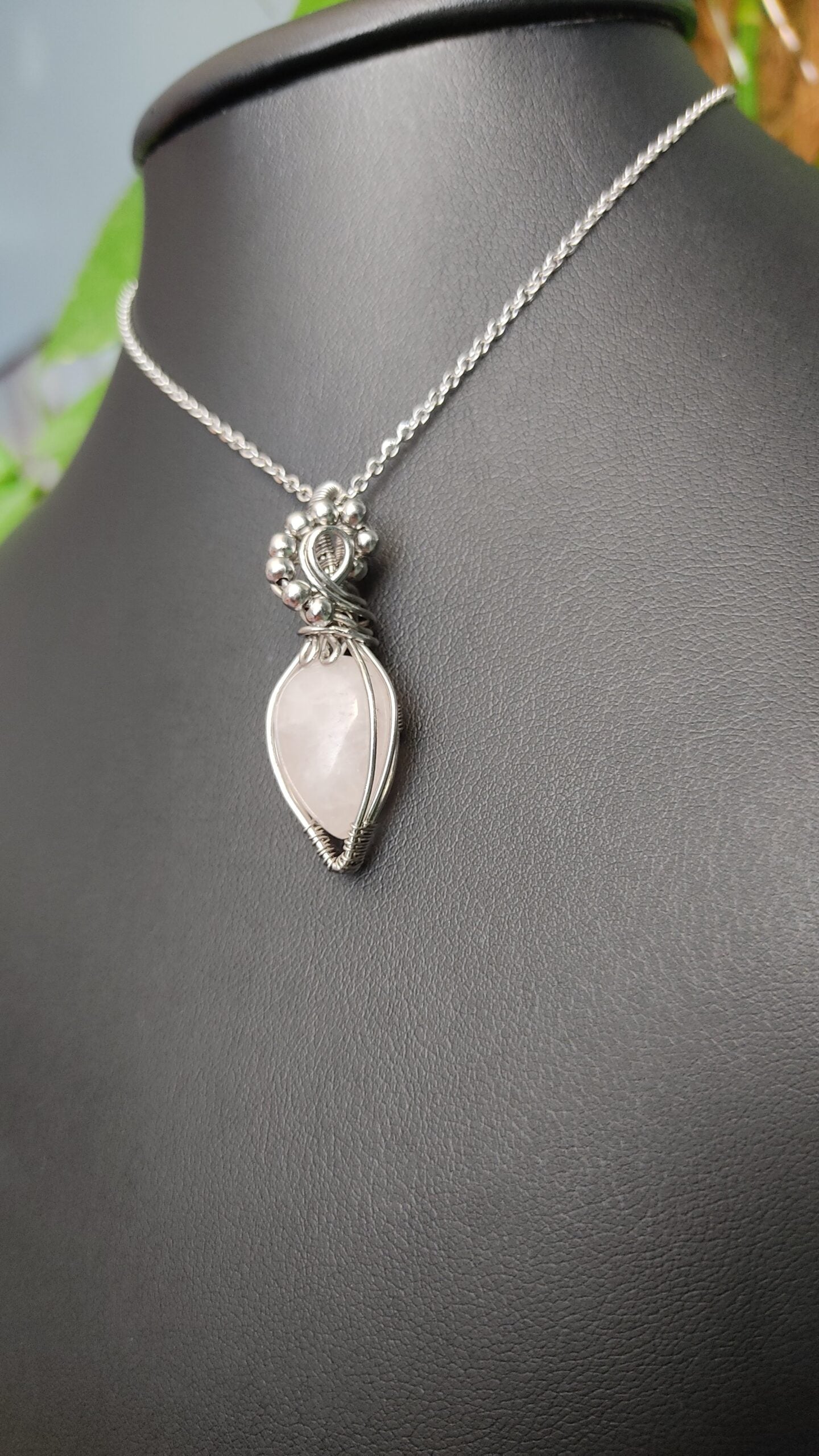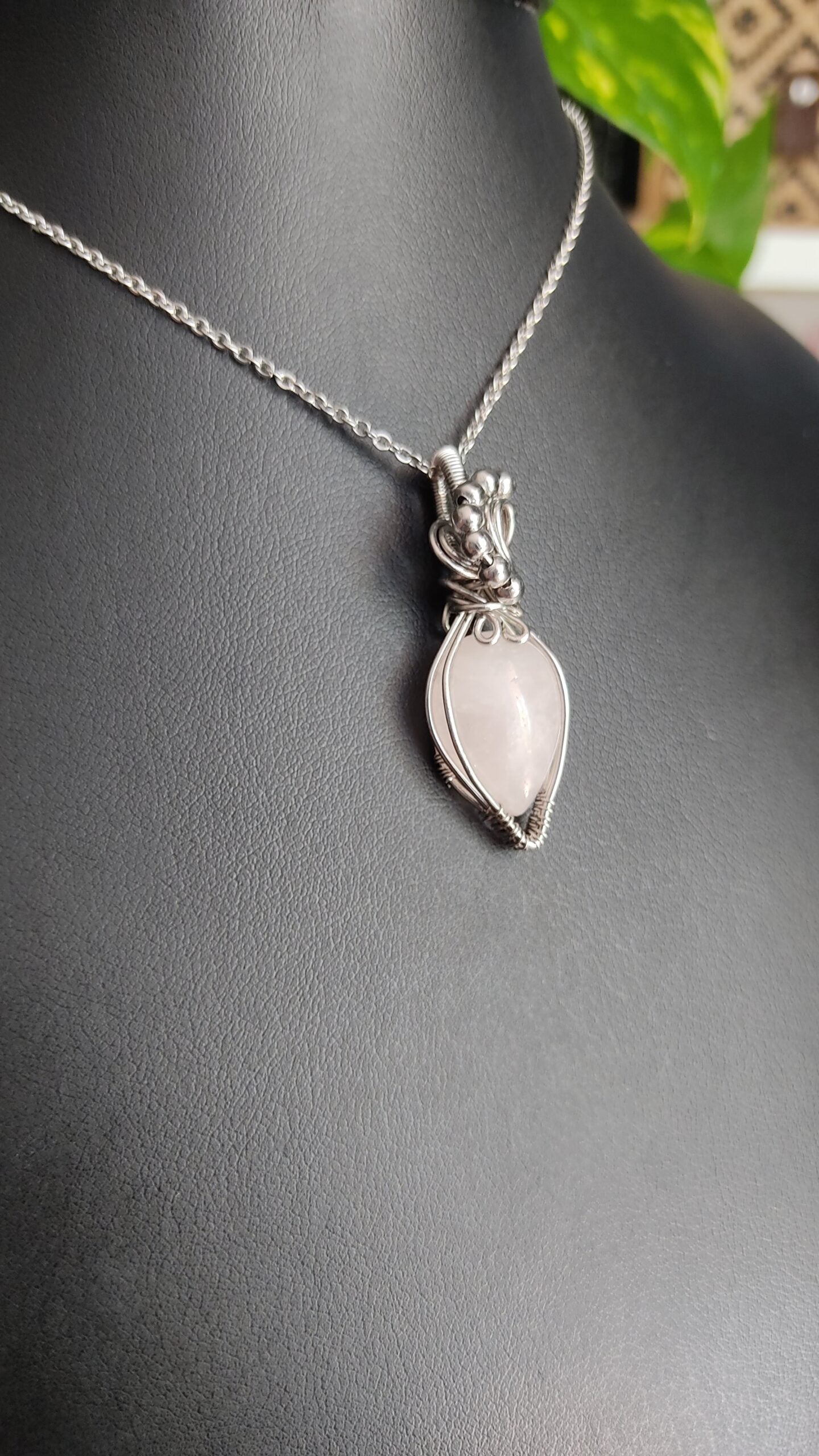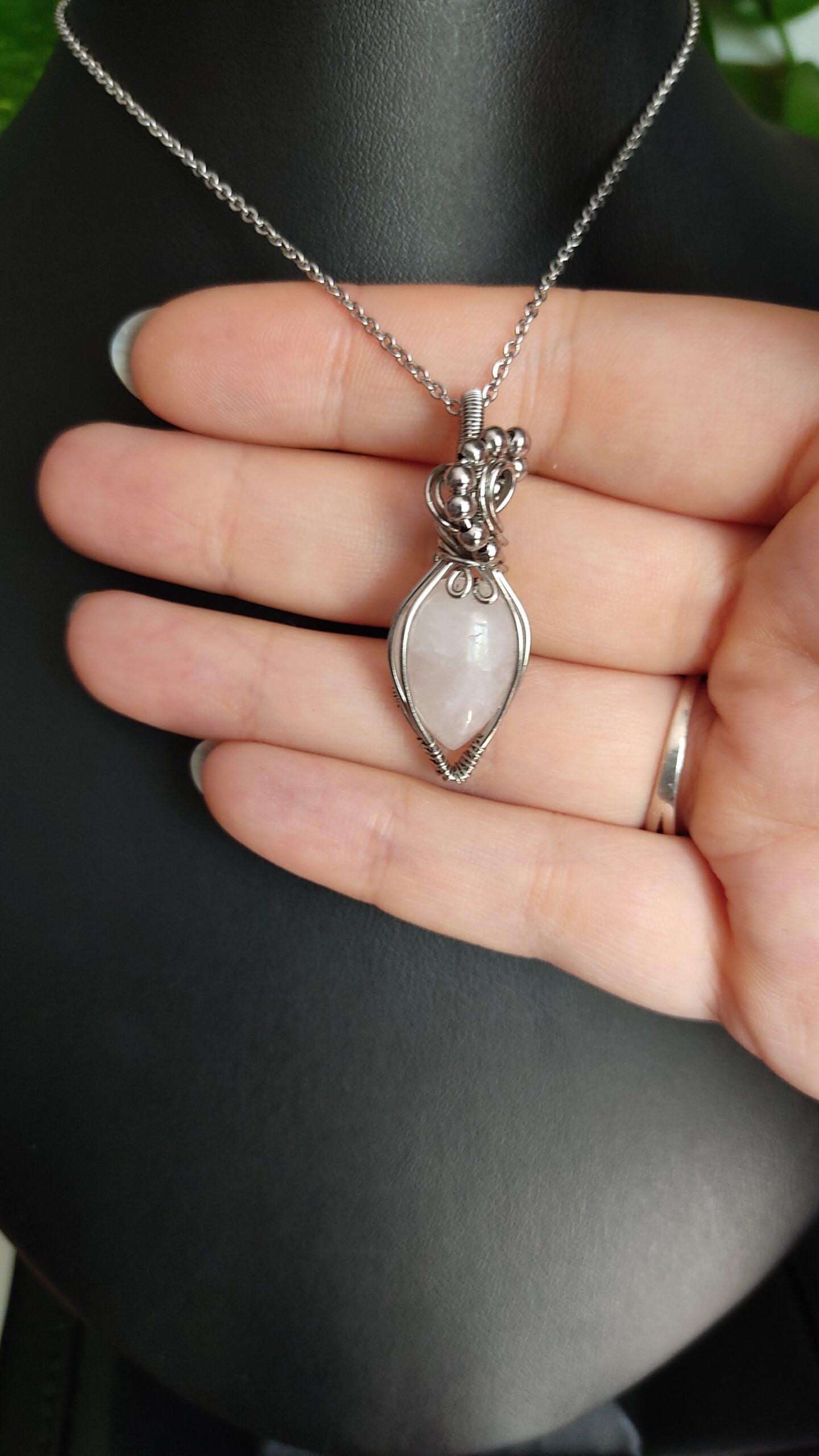 Ręcznie robiony wisiorek z kwarcem różowym. Wykonany techniką wire wrapping z drutów ze stali chirurgicznej.
