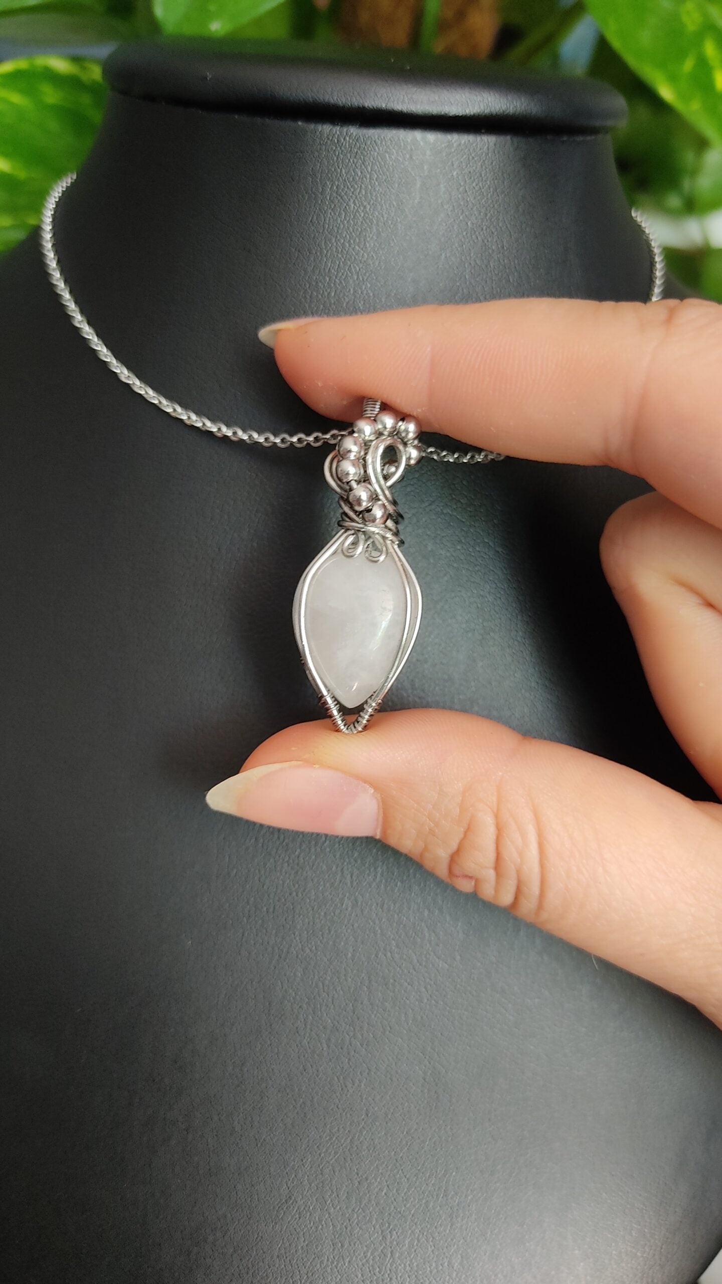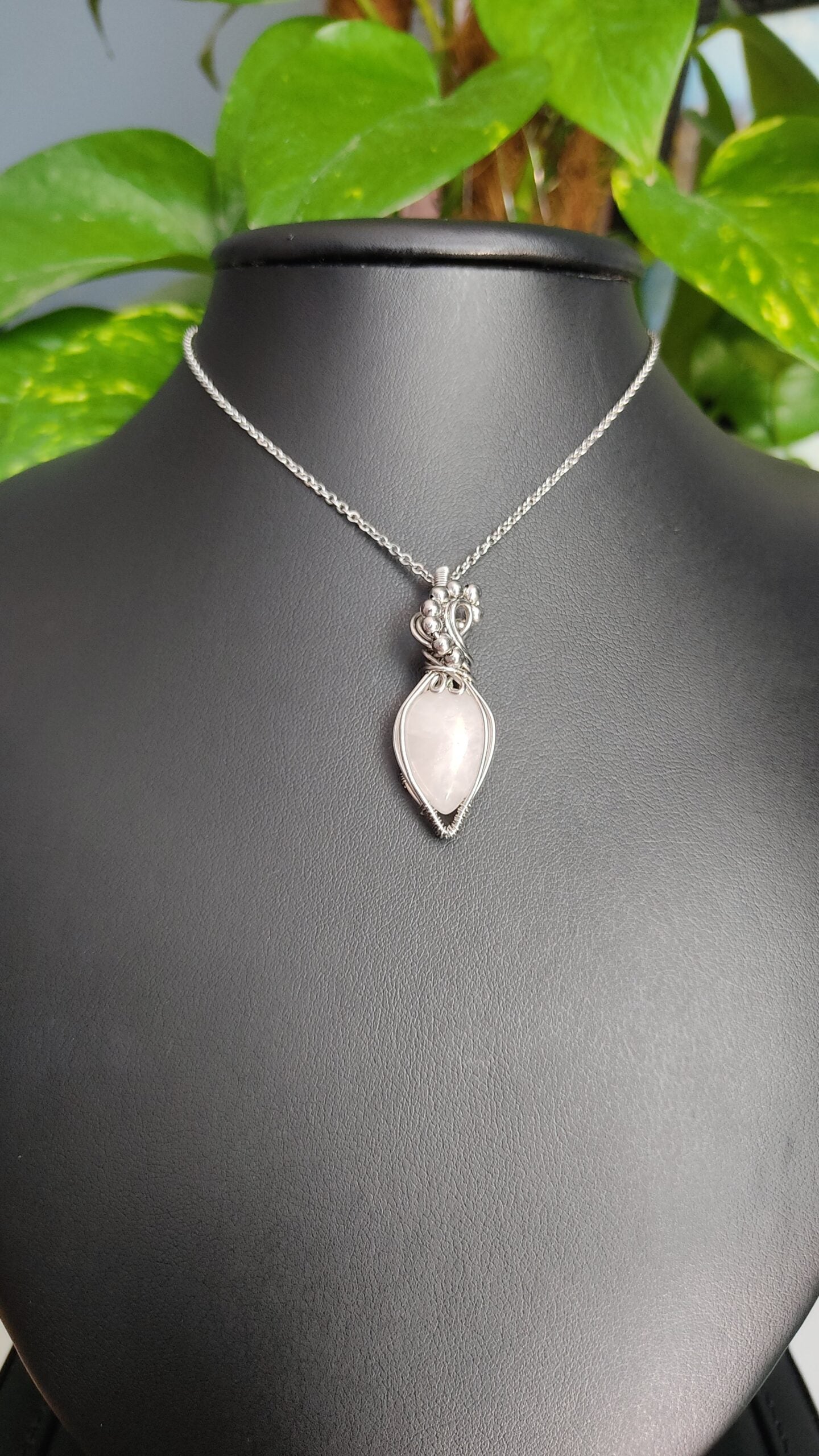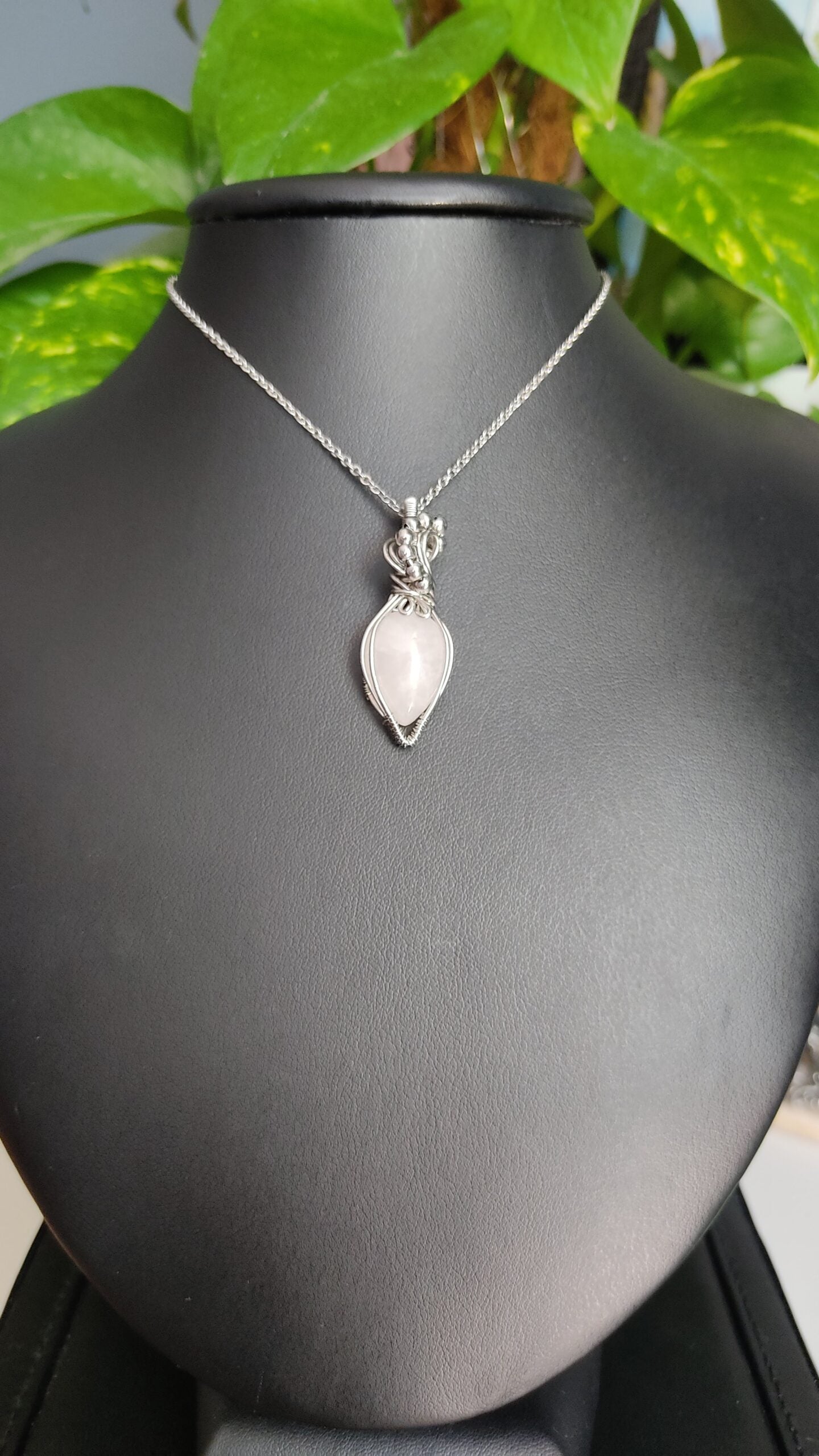 Ręcznie robiony wisiorek z kwarcem różowym. Wykonany techniką wire wrapping z drutów ze stali chirurgicznej.