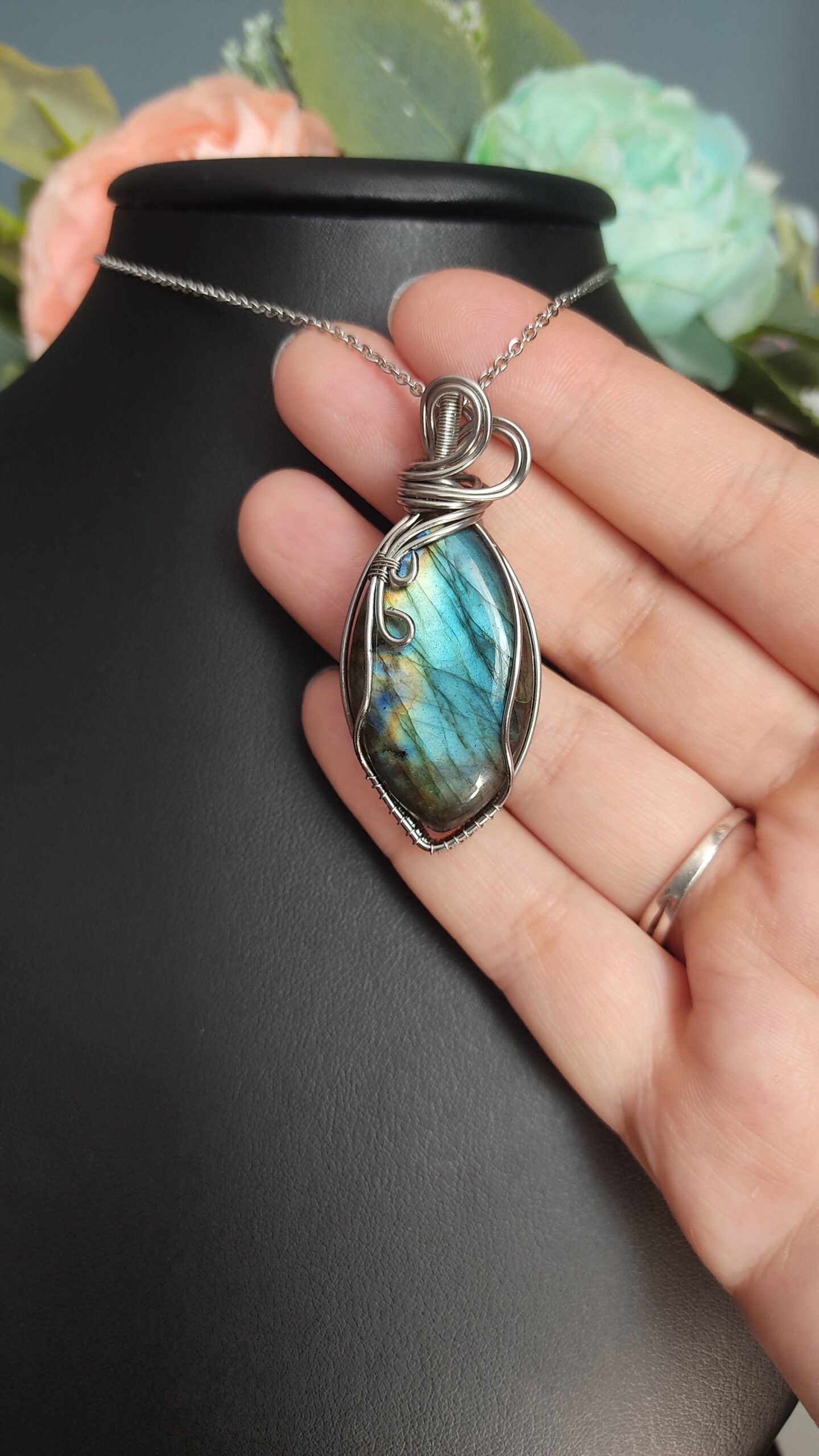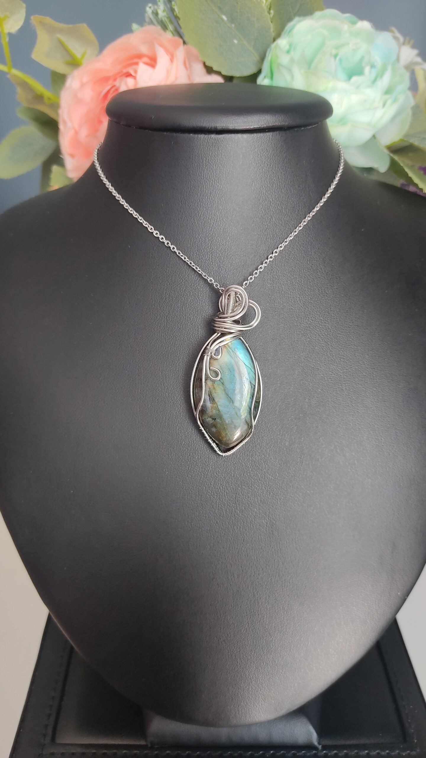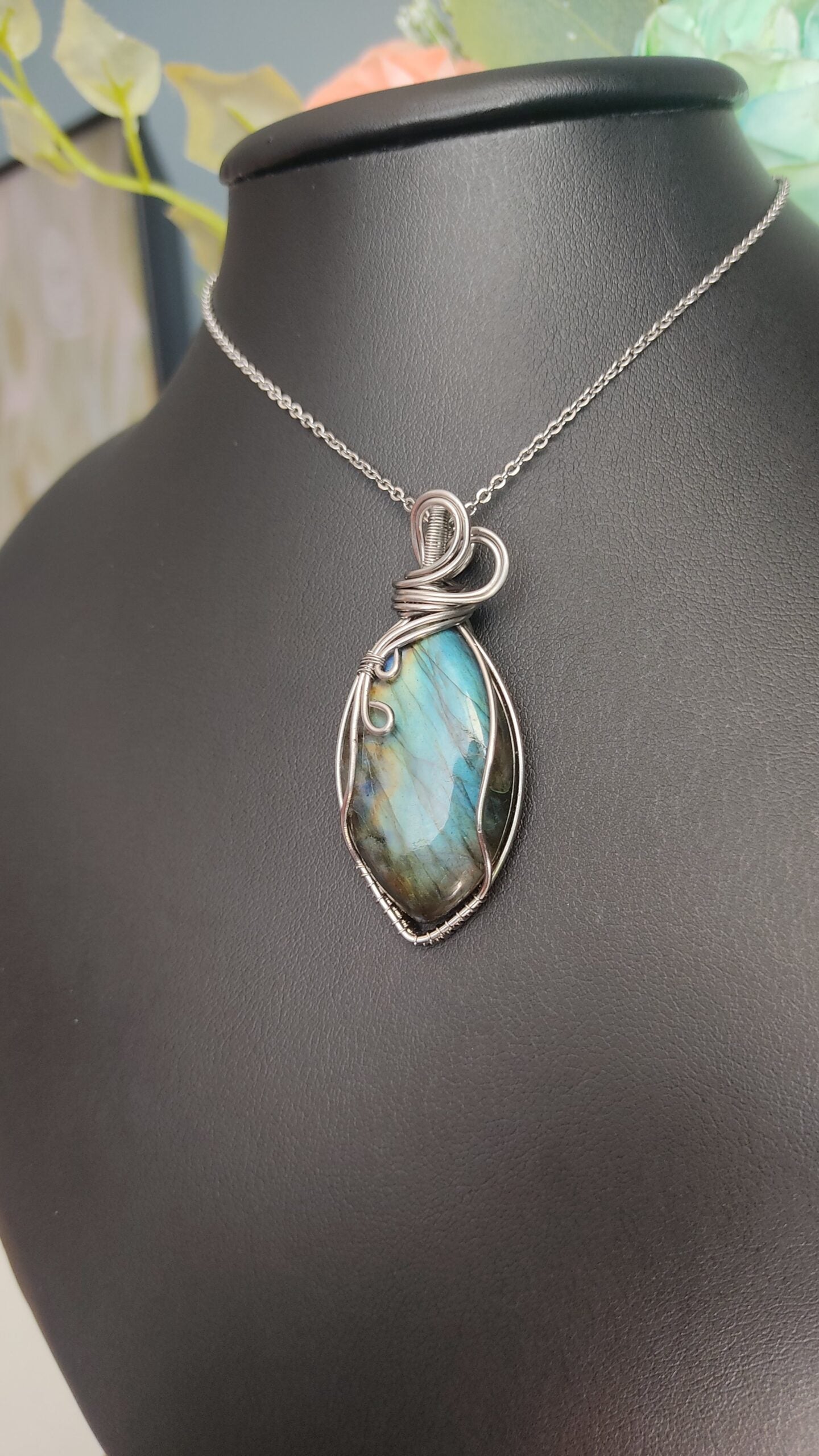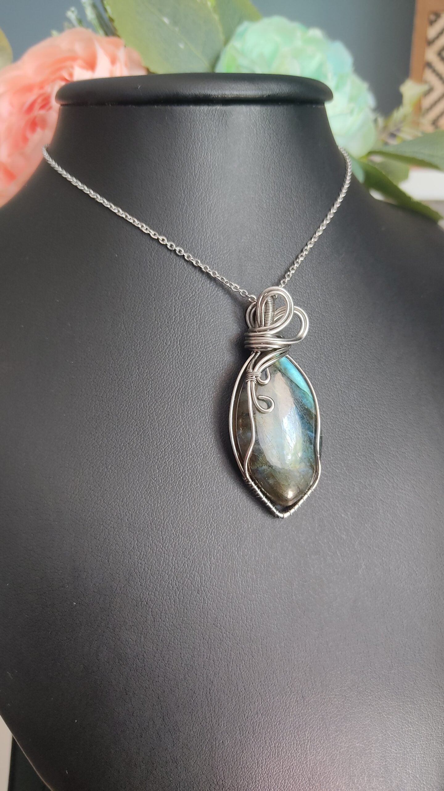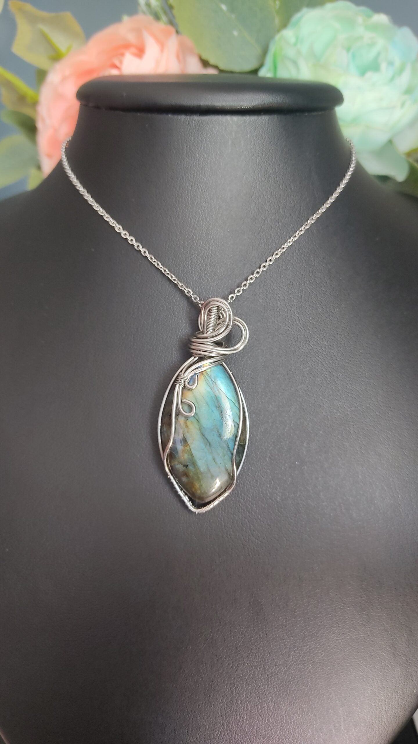 Ręcznie robiony wisiorek z labradorytem. Wykonany techniką wire wrapping z drutów ze stali chirurgicznej.