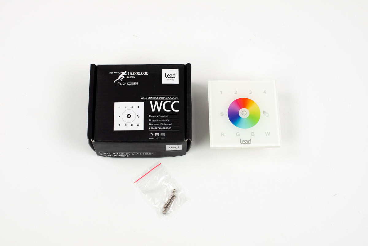 Ten przełącznik ścienny steruje panelami diodowymi Dynamic Color 30 i 63 firmy Lead Energy.