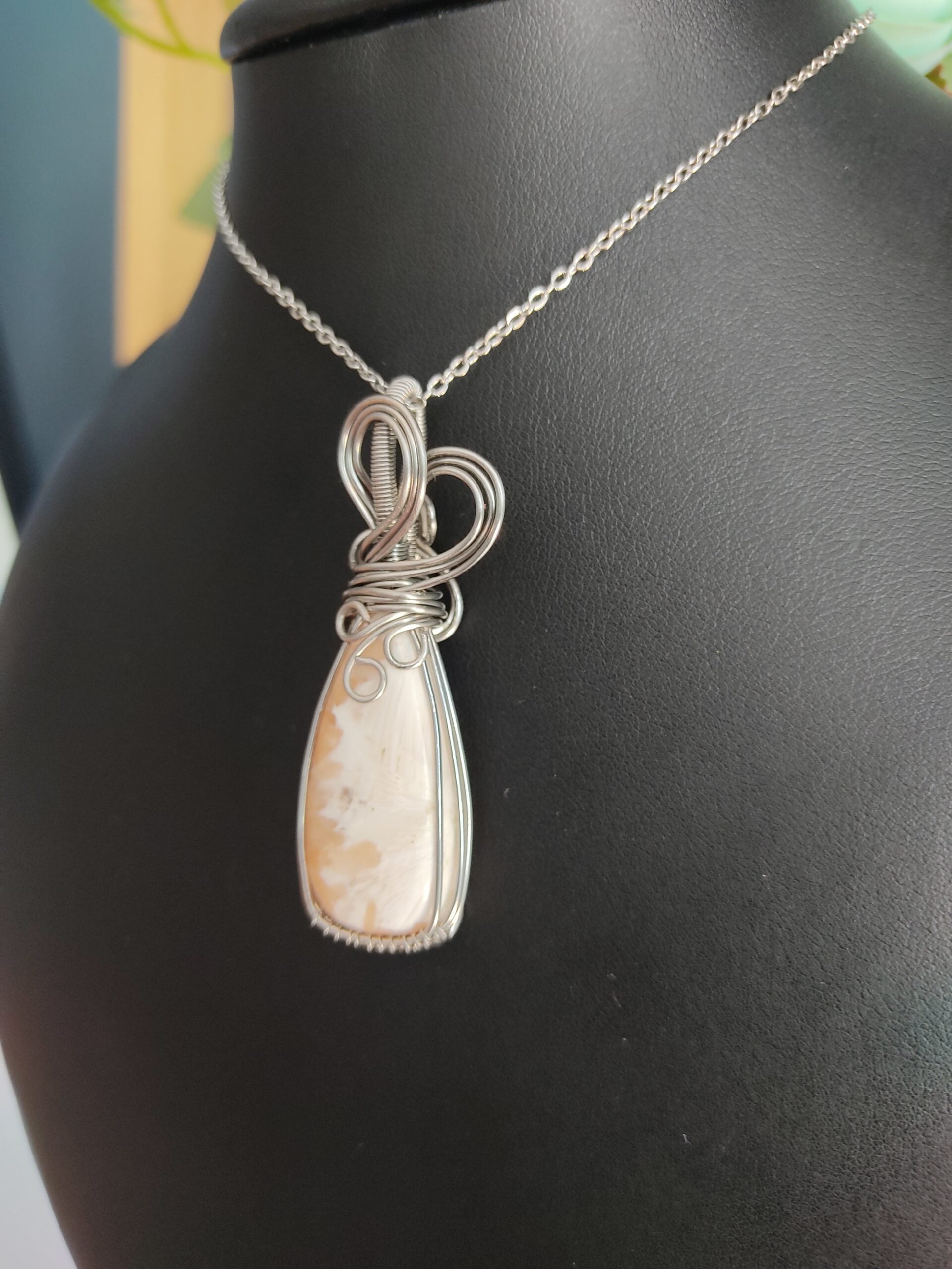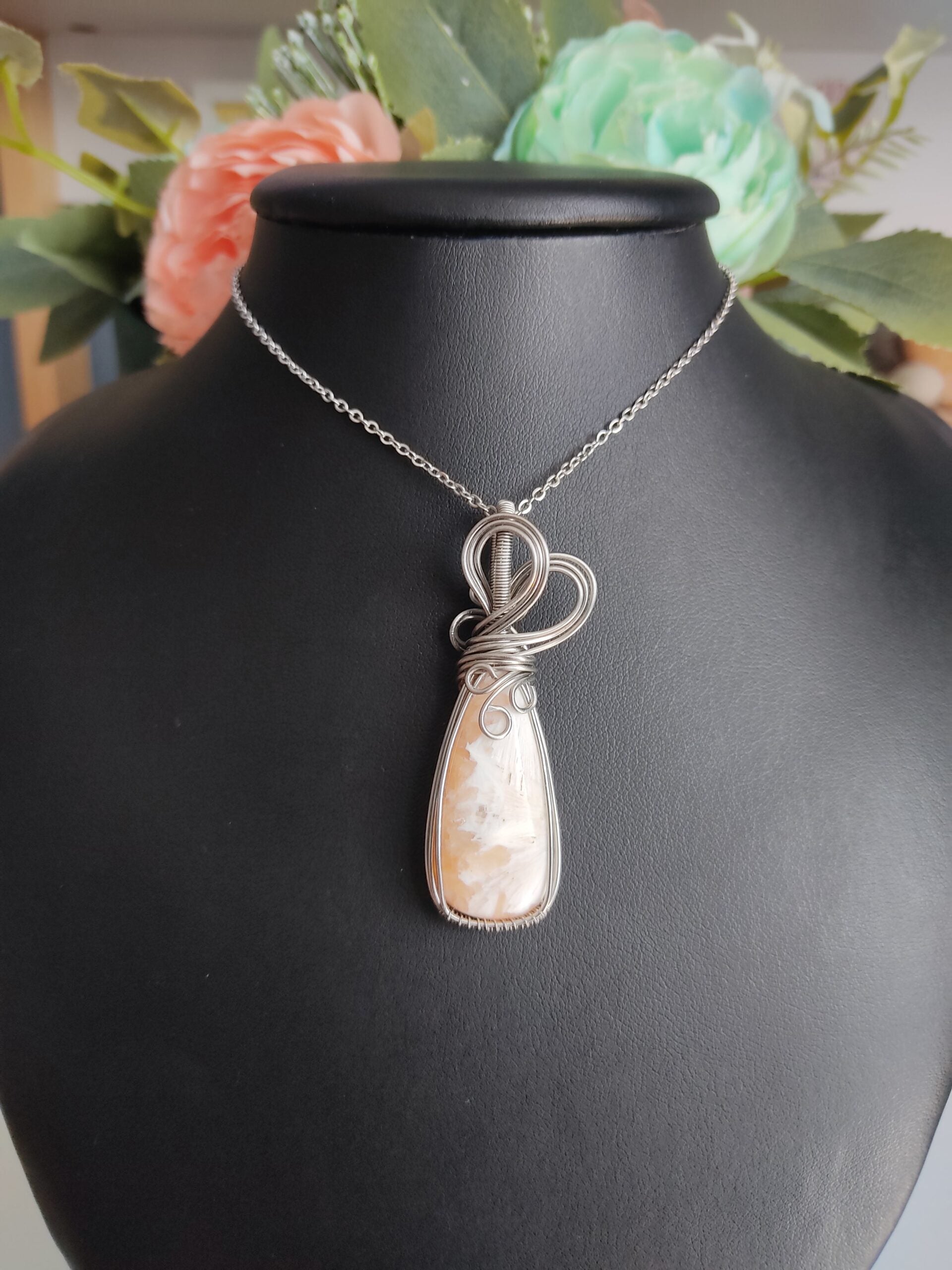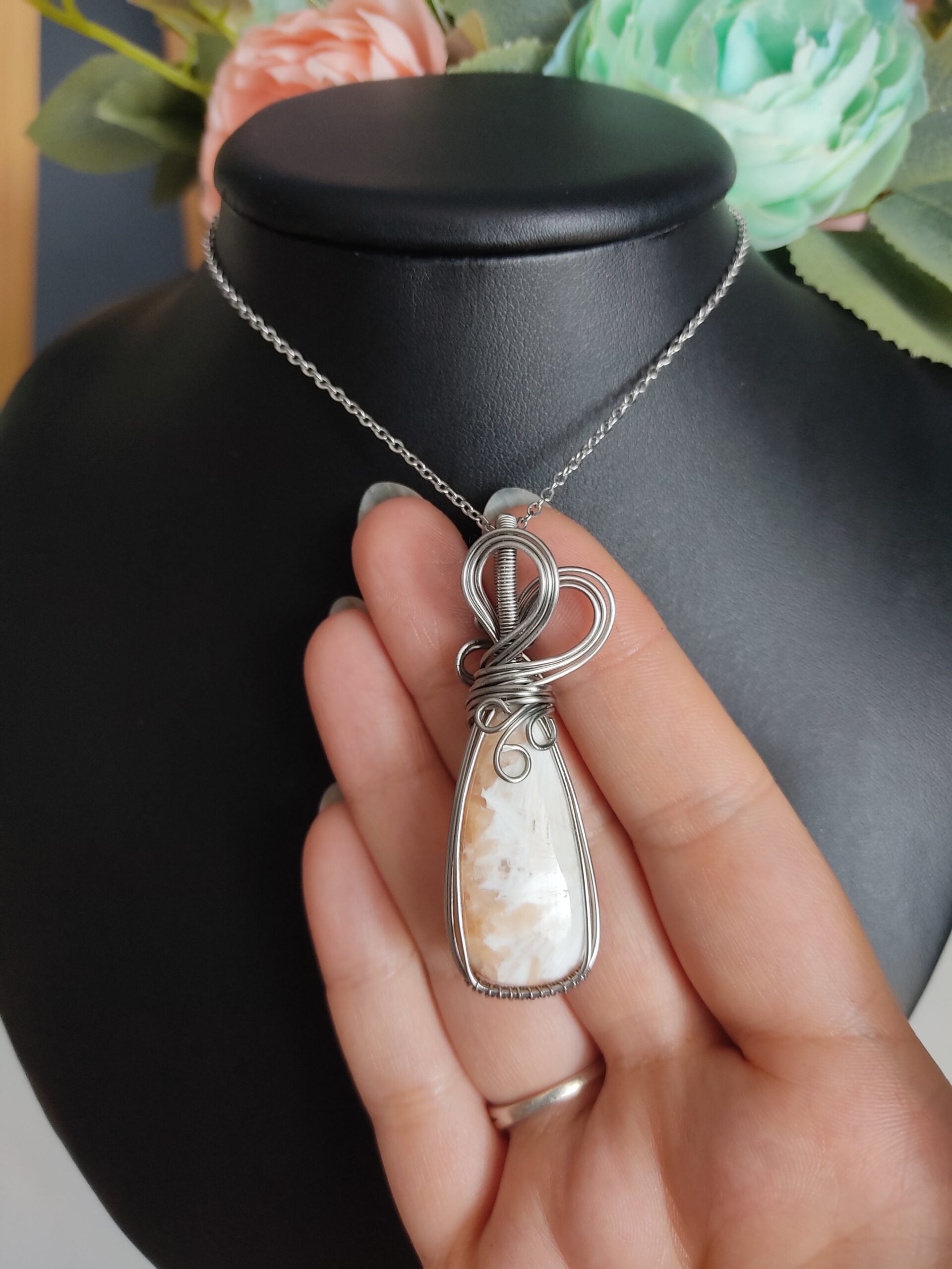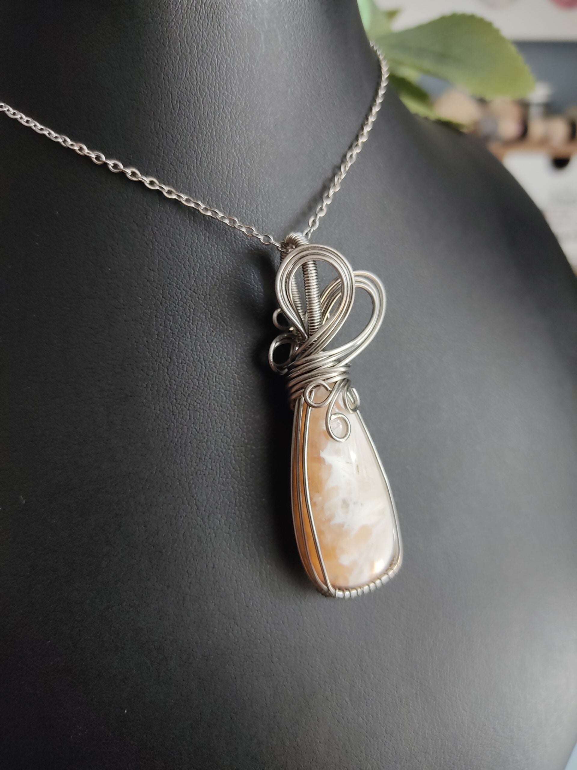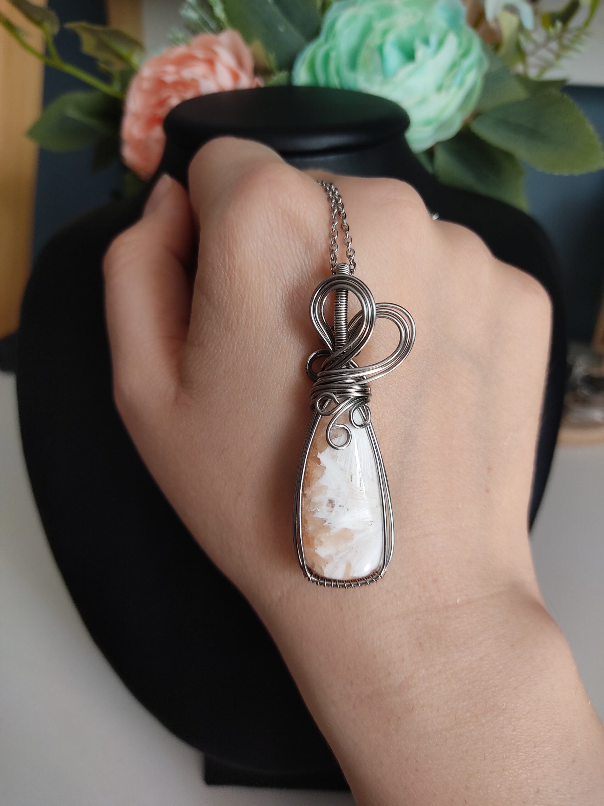 Ręcznie robiony wisiorek z skolecytem. Wykonany techniką wire wrapping z drutów ze stali chirurgicznej.